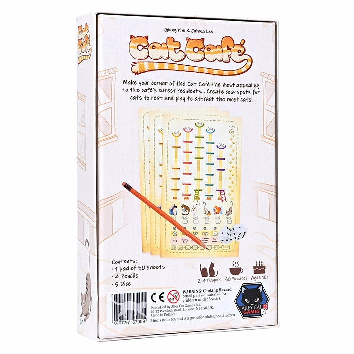 Cat Café is a reimplementation and slightly altered version of the Korean game Cat Tower by Mandoo Games. Cat Café is a light roll-and-write game in which players draft one die each round, then use the final unused die as well. Both dice are then used to 1) Draw a particular type of cat toy and 2) Place it on that level of a particular tower.