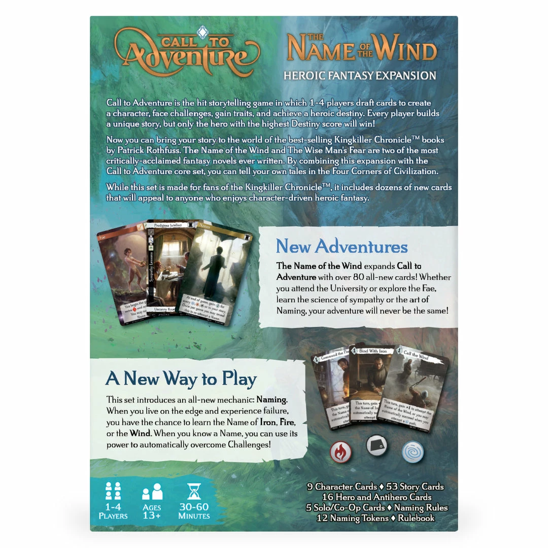 Set in the world of the New York Times best-selling Kingkiller Chronicle series, The Name of the Wind expansion allows players to build heroes and tell their stories in Patrick Rothfuss’s rich and compelling world using the Call to Adventure base game. The shuffle in expansion includes all new Origins, Motivations, Destinies, story cards, and Hero and Anthero cards, and introduces an all new mechanic: Naming. It’s a must buy for fans of Call to Adventure or fans of the books!