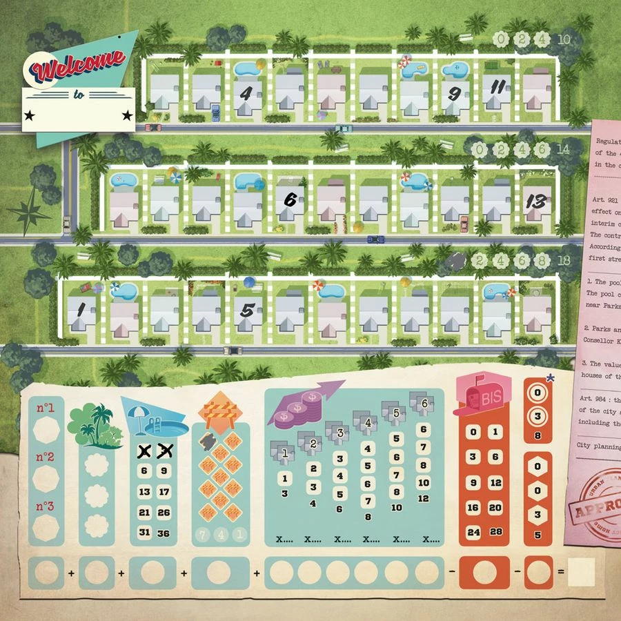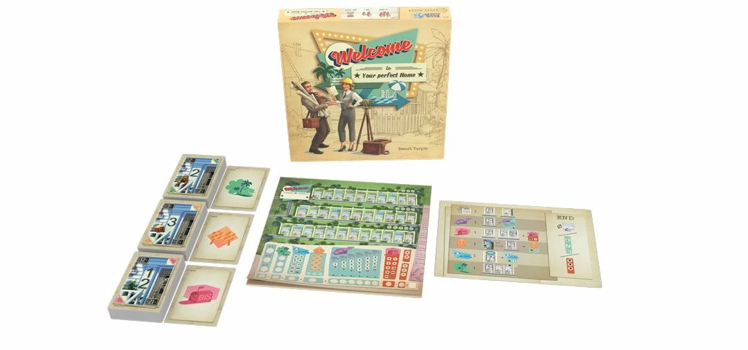 Welcome To… plays like a roll-and-write dice game in which you mark results on a score-sheet…but without dice. Instead you flip cards from three piles to make three different action sets with both a house number and a corresponding action from which everyone chooses one. You use the number to fill in a house on your street in numerical order. Then you take the action to increase the point value of estates you build or score points at the end for building parks and pools. Players also have the option of taking actions to alter or duplicate their house numbers. And everyone is racing to be the first to complete public goals. There’s lots to do and many paths to becoming the best suburban architect in Welcome To…!