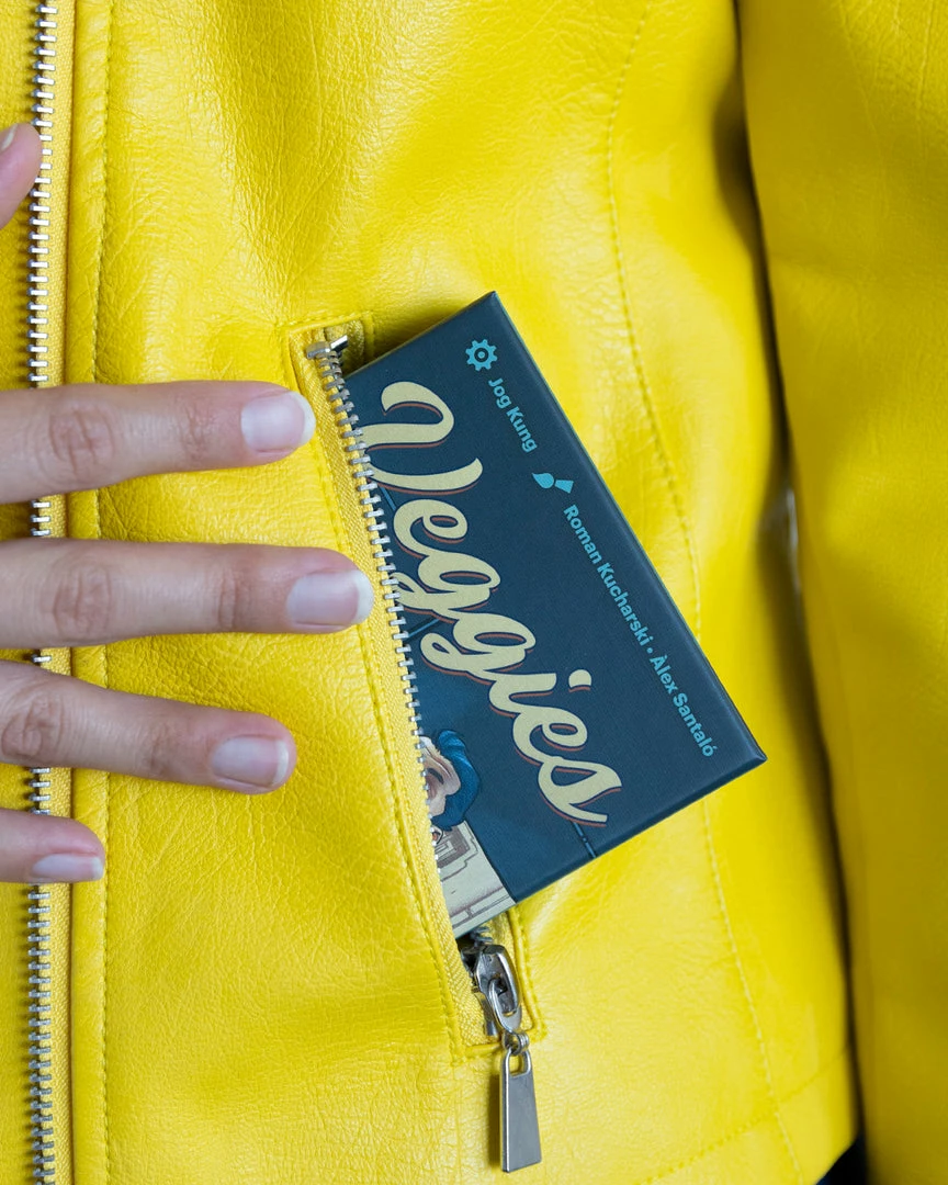 InΒ Veggies, a.k.a.Β Magazynier, 2-4 players compete to build the most successful produce stand in the market from eight cards that they’ll place turn by turn. Each card contains six spots in a 2×3 layout, with those spots containing strawberries, bananas, grapes, carrots, mushrooms, an empty pallet, or rats. On a turn, play the card in your hand or a card of your choice from the row of three cards into your personal layout. You can overlap the cards as you wish so long as you retain a grid structure to how they’re laid out. If you played from your hand, you draft a face-up card to end your turn, then reveal a new card.