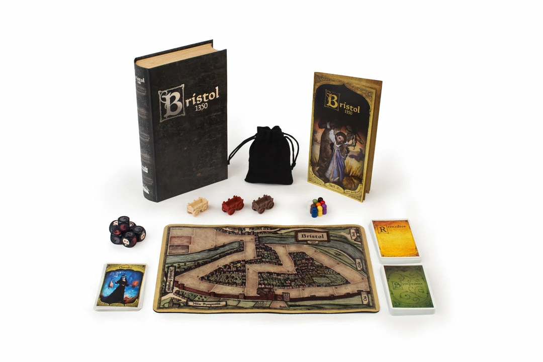 The dreaded black death has descended upon the town of Bristol. You are racing down the streets, desperate to escape into the safety of the countryside. If your cart is the first out of town you and your cart-mates win! Or do you? Some villagers on your cart may secretly already have the plague. If you leave town with a plagued villager on your cart, you will catch the plague and lose! What will you do to make sure that doesn’t happen? And who will you trust (or betray) along the way? Bristol is a light strategy and social deduction game for 1-9 players. Learn in 10 minutes and play in 20-40 minutes.