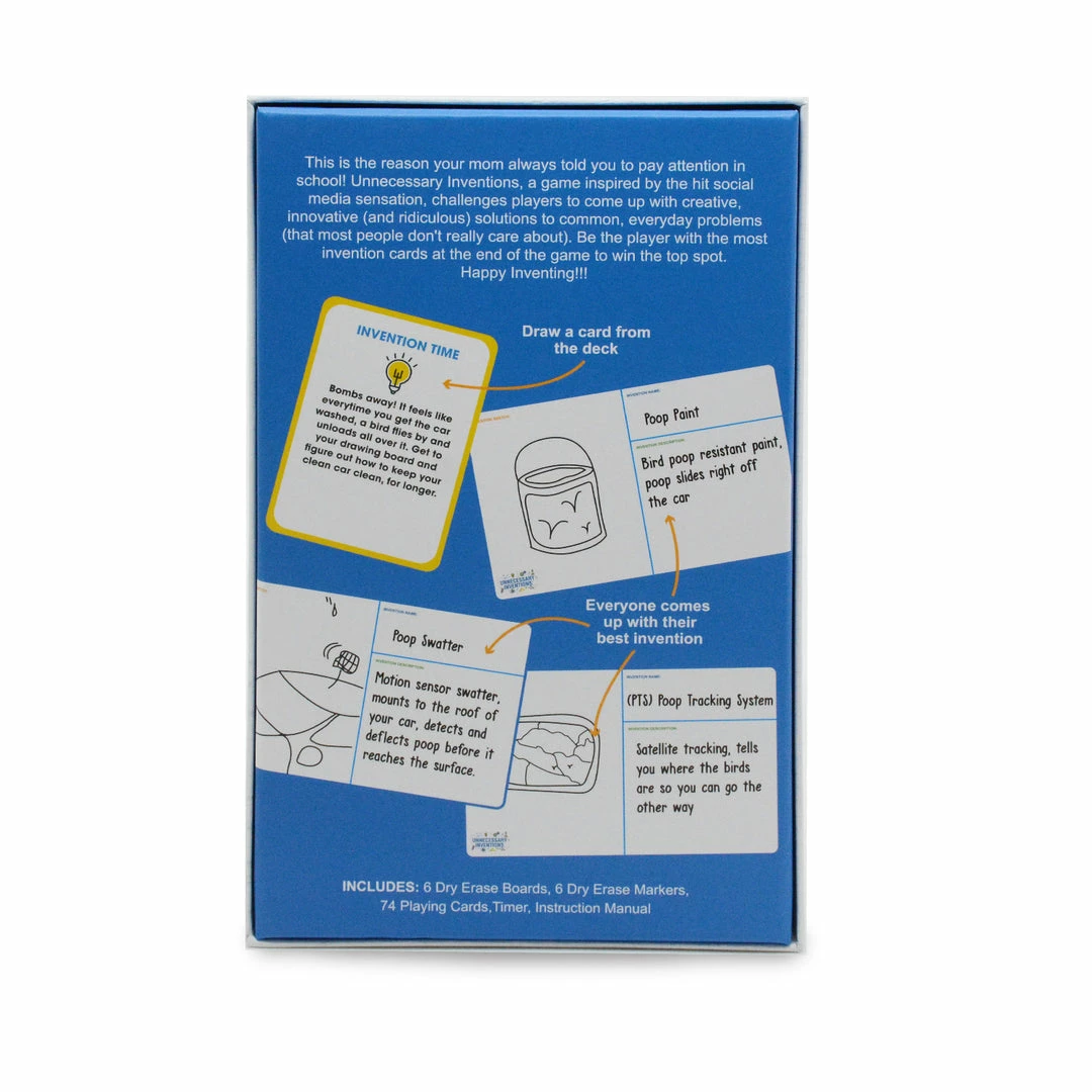This is the reason your mom always told you to pay attention in school! Unnecessary Inventions, a game inspired by the hit social media sensation, challenges players to come up with creative, innovative ( and ridiculous) solutions to common , everyday problems ( that most people dont really care about). Be the player with the most invention cards at the end of game play to win the top spot. Happy Inventing!!