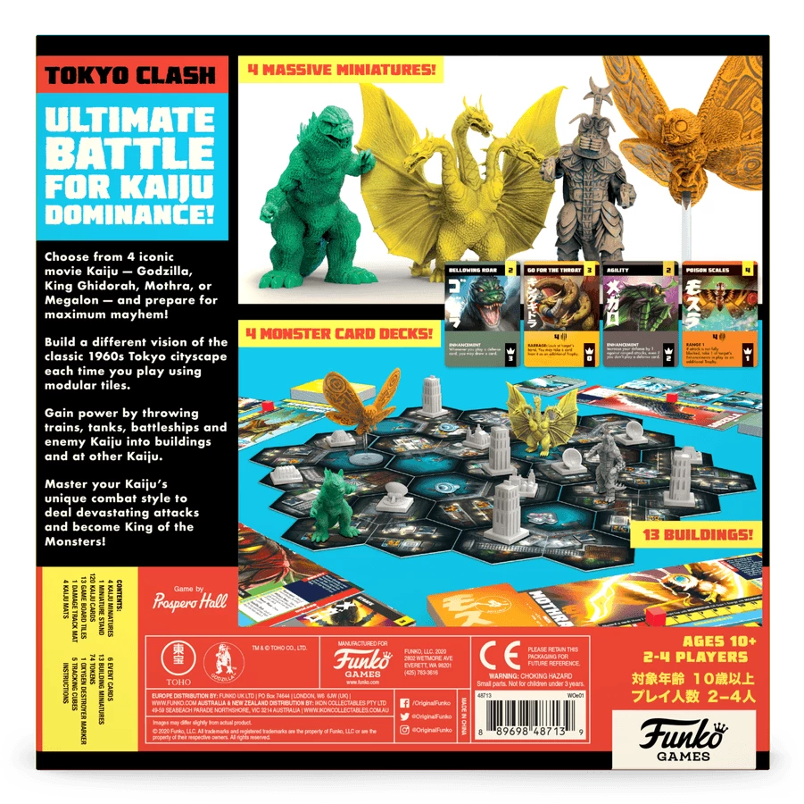 In Godzilla: Tokyo Clash, you play as the Earth’s most fearsome Kaiju — Godzilla, Mothra, King Ghidorah, and Megalon — battling for dominance as the most terrifying monster in Japan. With detailed miniatures of the legendary monsters and a modular cityscape of 3D buildings to destroy, it’s an epic battle every time you play!