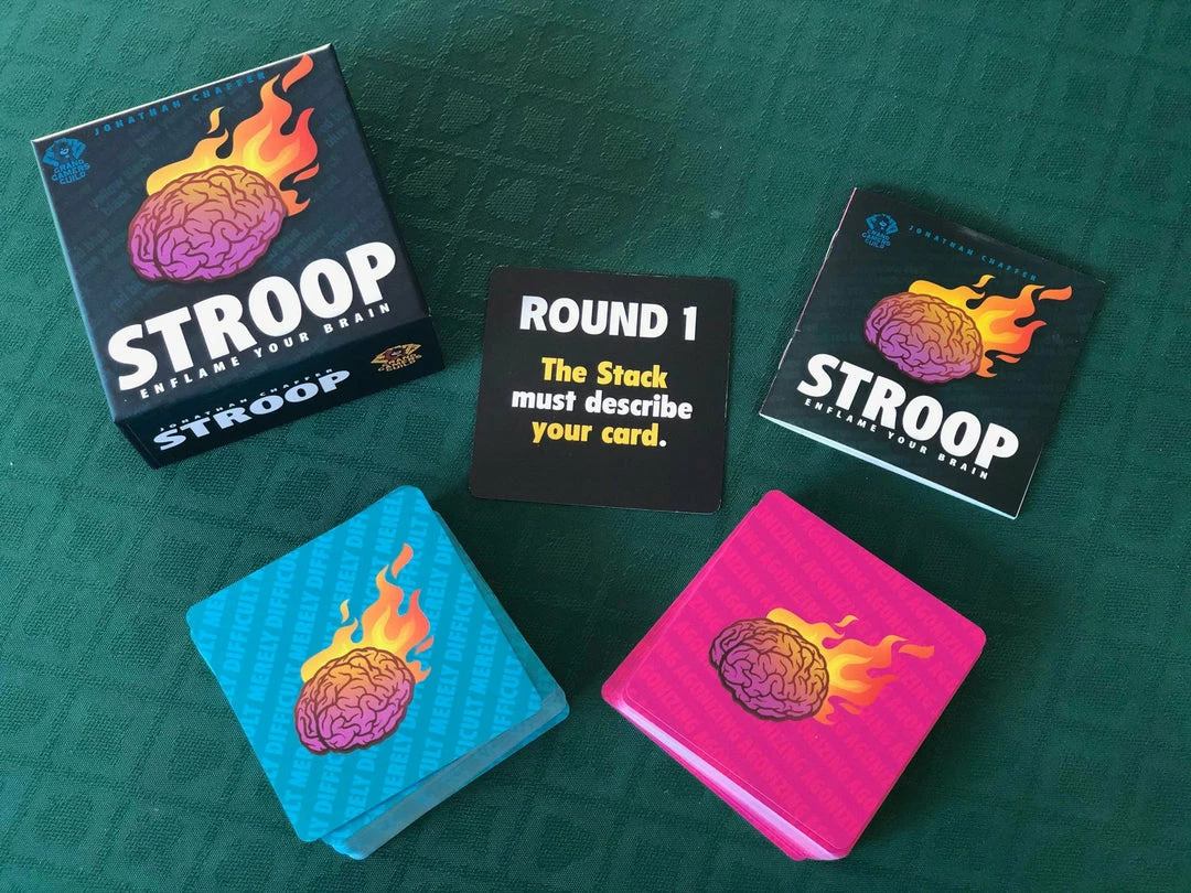 The cards inΒ StroopΒ each display a single word. The words are printed in several colors (black, red, blue, and yellow), sizes (big and little), and styles (hollow and solid), and they have different numbers of letters (three, four, five, and six). The challenge is to read one word and quickly match it with the description of another word β without regard to what the second word says.