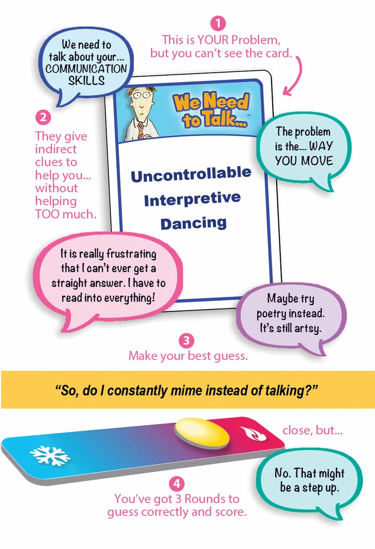 In ο»ΏWe Need To Talk, players take turns being the focus of an intervention by drawing a Problem card with a nonsensical problem like, “Uncontrollable Interpretive Dancing” or “Neurotic Inability to Turn Right”. They can’t see the card, but all the Concerned Friends and Family can. Friends will give obscure clues that hint at the problem, without giving it away. The sooner the Intervened can guess the problem, the more points they’ll score. The longer the Concerned Friends keep them guessing, the more points the Friends can earn. Each of the three rounds have a unique format for giving clues, Broaching the Subject, The Emotional Appeal and Offering a Solution. But if the Intervened cannot guess their problem by the end of the third round, no one will score any points, having failed to help their friend.