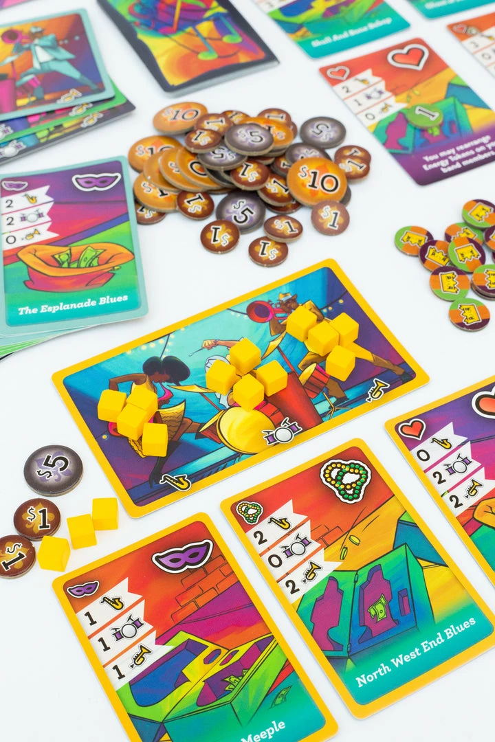 Big Easy Busking is an area control game for 1-5 players about being the best street musician in New Orleans. The game is played over three days, where players choose which locations to play their set of songs. It takes time to play a song, so players decide on their next turn whether they’re going to use all of their energy at the location or to only use some of it to save the rest for later songs. If a player matches the mood of the people with the song that they’re playing, they can get bonus tips!